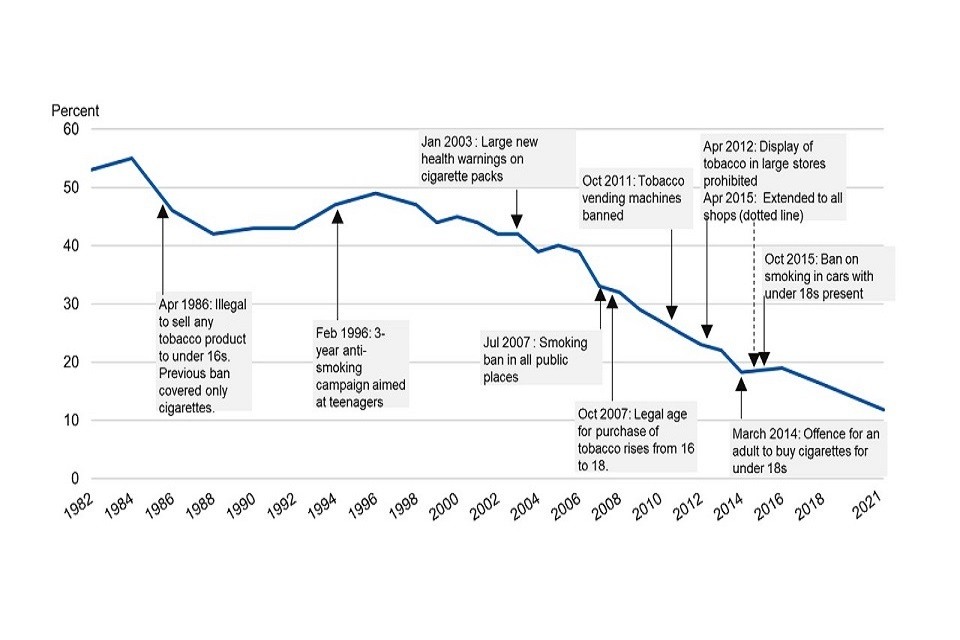 During this period, regulatory interventions have included; progressive increases in taxes, a complete advertising ban in 2003, a ban on smoking in public spaces in 2007, raising age of purchase from 16 to 18 in 2007, a ban on tobacco vending machines in 2010, a ban on point of sale product displays in 2012, and the introduction of plain packaging in 2017. In addition to these regulatory interventions the emergence of nicotine vaping products around 2012, essentially a disruptive technology with welcome, if largely accidental, health benefits helped accelerate the fall in smoking since that time as growing numbers of smokers switch, or younger people adopt vaping instead of smoking.